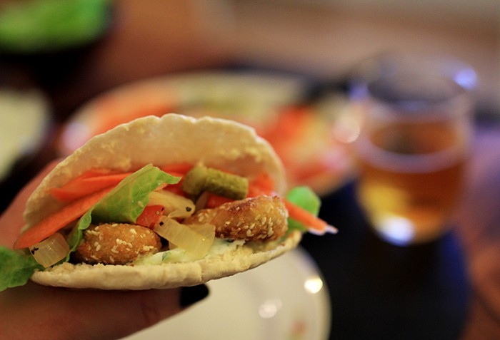 Slängde ihop fejkfalafel (falafeln var slut så vi fick köpa sesamnuggets i stället till Lovisas stora förtret) med tzatziki samt diverse goda grönsaker i pitabröd. Till detta delade vi på en flaska öl. Gottigottgott!