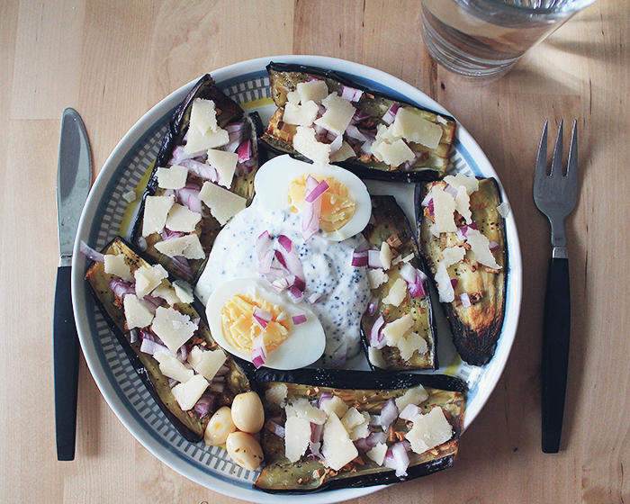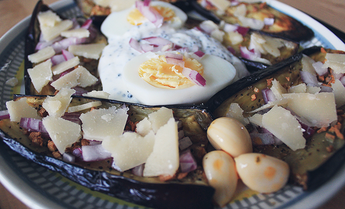 Jag är en mästare på att koka soppa på en spik och hör och häpna – oftast smakar det faktiskt riktigt smarrigt (i alla fall enligt min gom). Min senaste rätt bestod av vitlöksrostade aubergineskivor toppade med rödlök och hyvlad parmesan. Till detta serverades ett delat kokt ägg med gräddfil och tångkaviar. Och som en liten apertif, tre inlagda vitlökar vid sidan av. Och hur smakade detta matpotpurri? Ja rätt ok faktiskt. Samt en hel del vitlök.