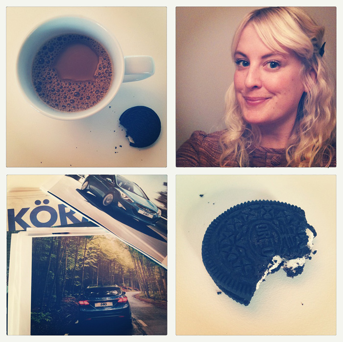 Idag är en sådan där mellandag. Gårdagen slutade i migrän och tidig sänggång, men nog fan har jag varit dundertrött idag. Är lite smått omotiverad och känner mig inte direkt kreativ, vilket inte är jättebra om det man arbetar med innebär att vara just… kreativ. Försöker beta av projekt som är i sluttampen, men musten går liksom ur mig hela tiden. Som tur var blev jag precis bjuden på kaffe och Oreo-kakor. Jag ryser lite när jag ser Oreo-reklamen, men detta gjorde susen! Så jobbajobba lite till för att senare ikväll bli bjuden på middag hos Klara. Win!