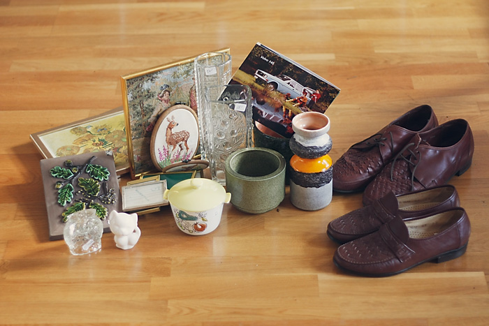 Här ovan kan ni se lördagens loppisfynd. Eller ja, allt är inte med på bilden, det som saknas är golfvagnen David fyndade som inte riktigt fick plats. Och nu har jag fått blodad tand, för gud vad kul det är med loppisrundor! Och har man bara lite tid på sig så hinner man med en massa, ja förutom att gå på loppis kan man hänga vid ett flygfält och kolla på när folk hoppar fallskärm. Skrämmande kul såg det ut att vara! Nåväl här kommer loppisbilderna:
