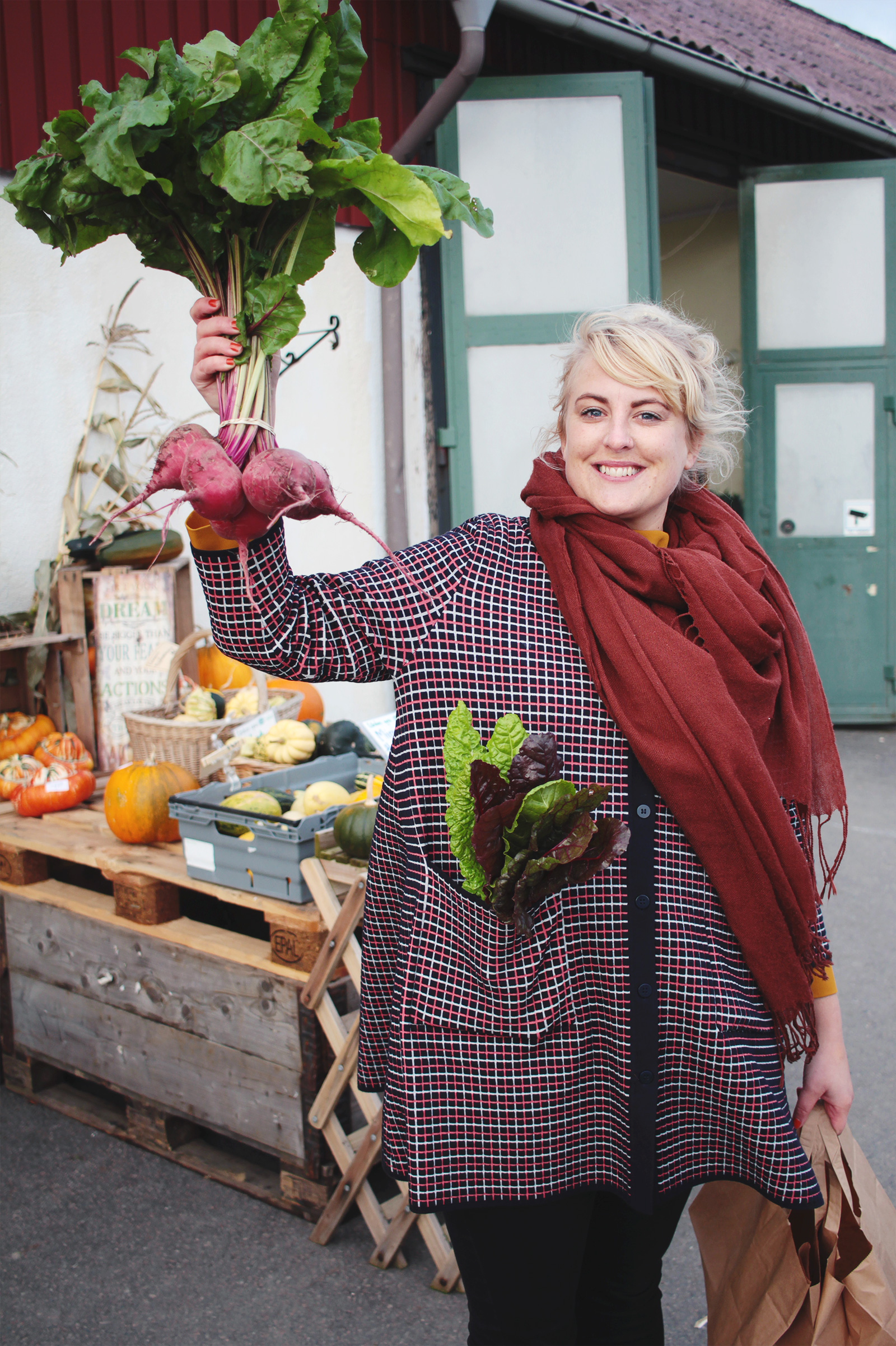 Efter slottsvisningen for vi tillbaka mot stan igen. Men först tog vi ett stopp vid Mariebergs Gårdsbutik för att botanisera bland pumpor, blommor och närodlade grönsaker. Så himla fint där, så ska visa er lite fler bilder därifrån en annan gång. Här står jag och poserar med ett gäng polkabetor samt en klase mangold i fickan.